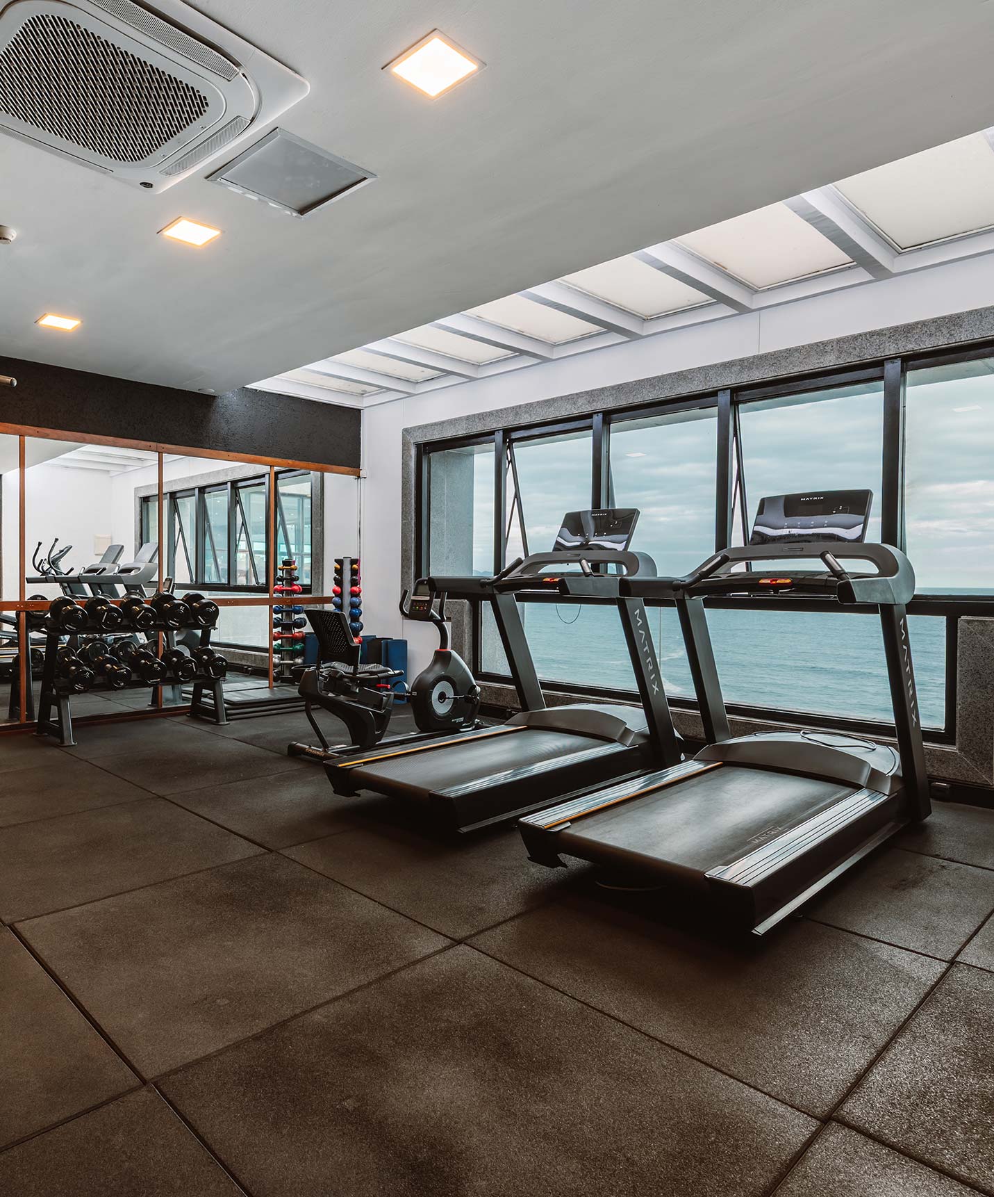 Con luz natural, vistas al paseo de Copacabana, modernos equipamientos y climatización, el espacio ofrece comodidad y calidad para realizar entrenamientos de diferentes intensidades.
