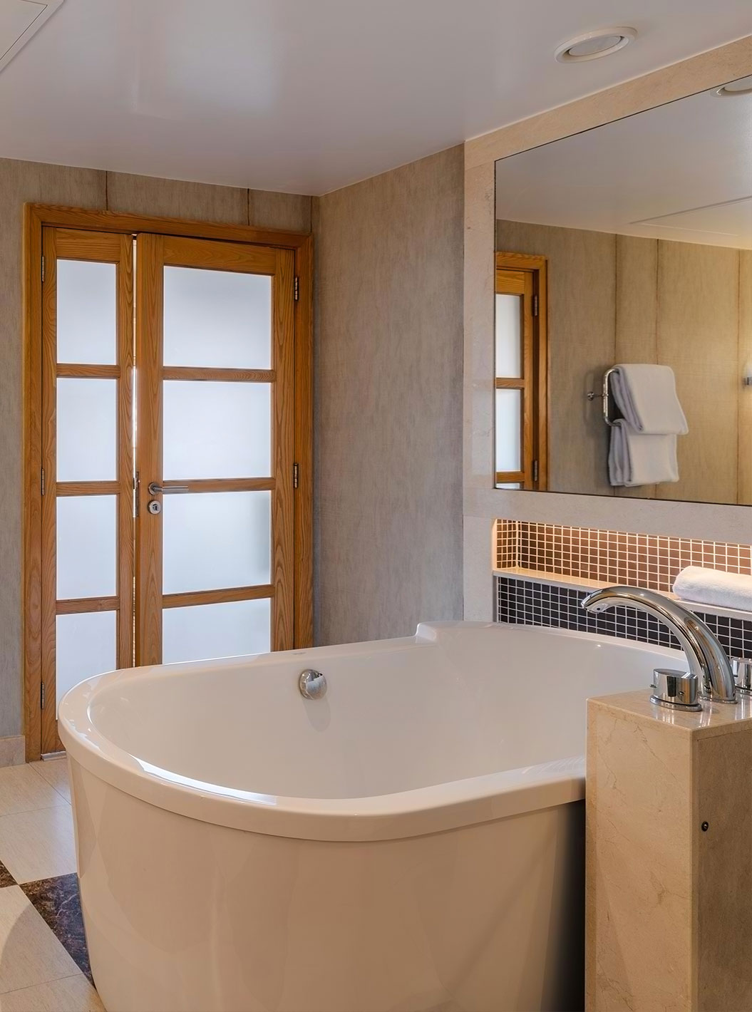 De ontspanningsruimtes nodigen je uit, net als de fitnessruimte, de massageruimte en het binnenzwembad, met tientallen ligstoelen en frontaal uitzicht op zee.