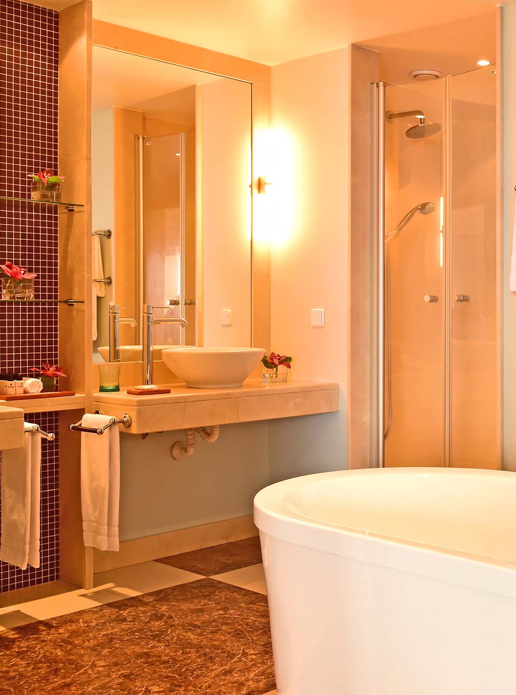 De Classic Twin Pool View van Pestana Carlton Madeira heeft een badkamer met bruine tegels en een bad
