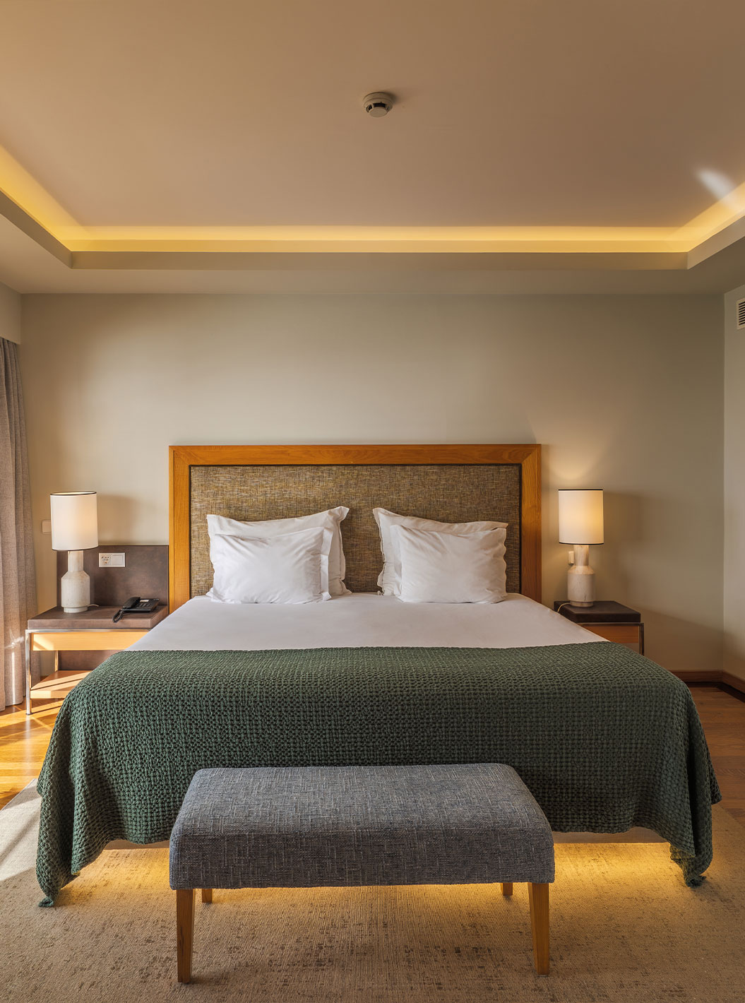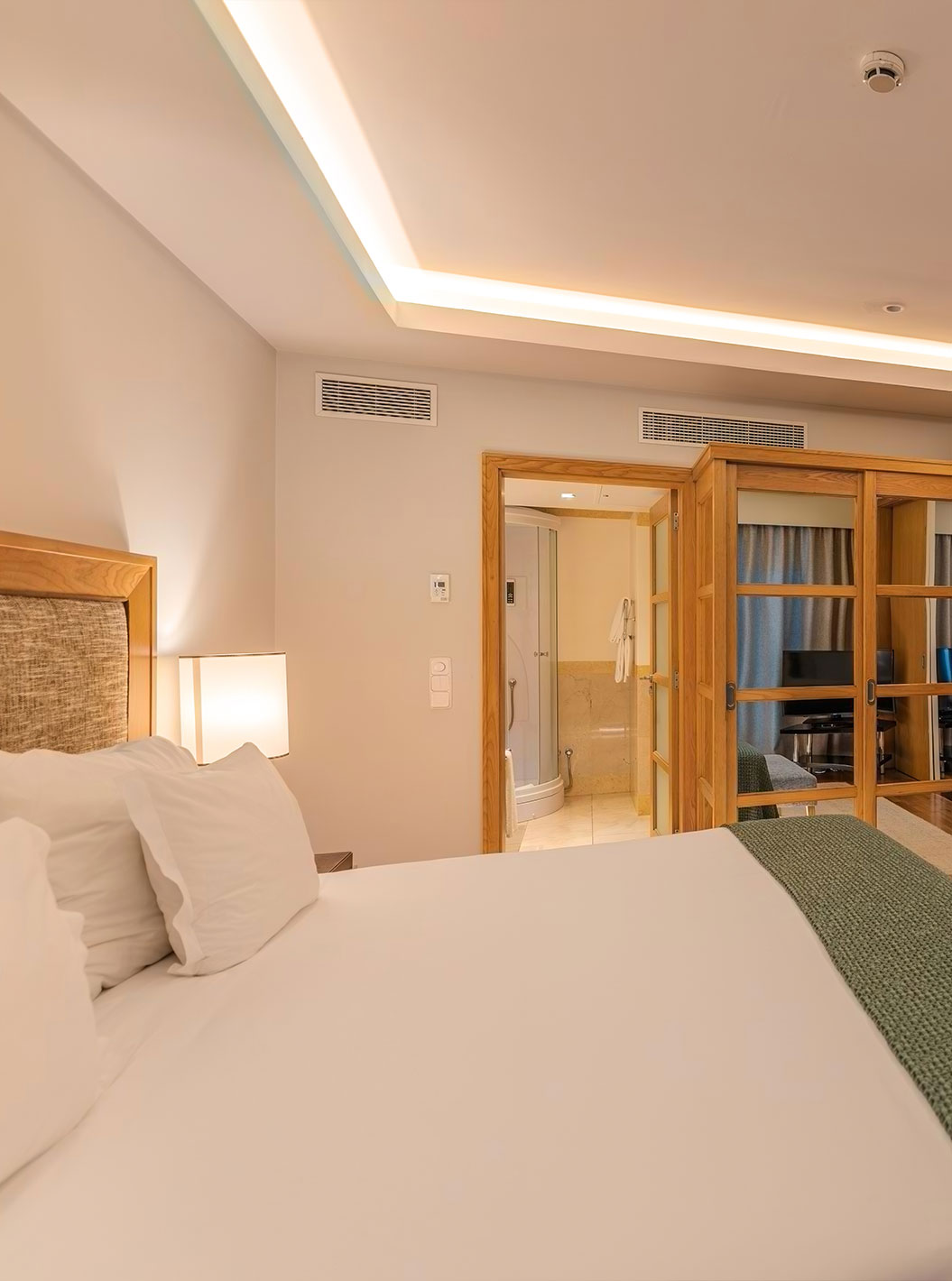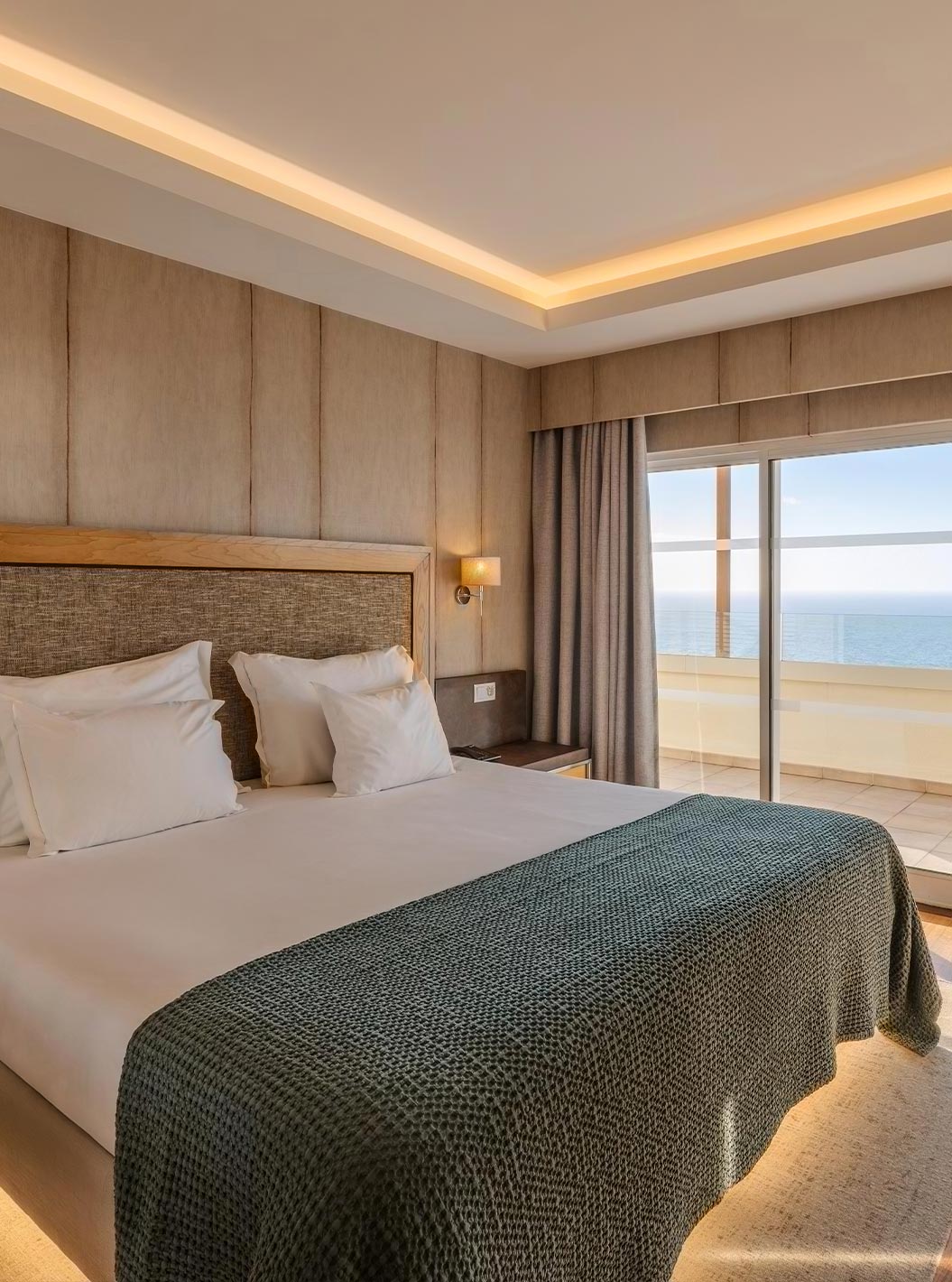 De Junior Suite van Pestana Carlton Madeira heeft een tweepersoonsbed met een bank aan de voet en een kast met spiegels
