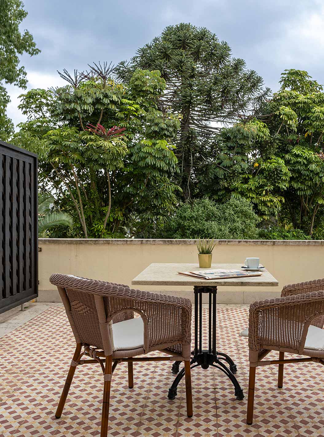 De Deluxe Garden van Pestana Palace Lisboa heeft een tweepersoonsbed, twee nachtkastjes, bureau en raam met tuinzicht
