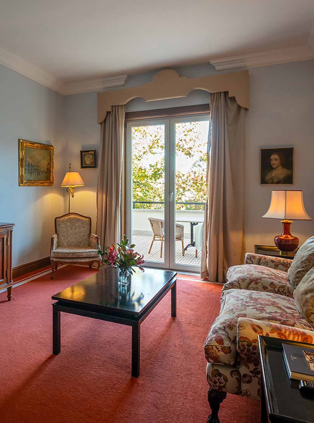 De Suite Collection van Pestana Palace Lisboa heeft een kamer met bank, televisie, raam met balkon en schilderijen