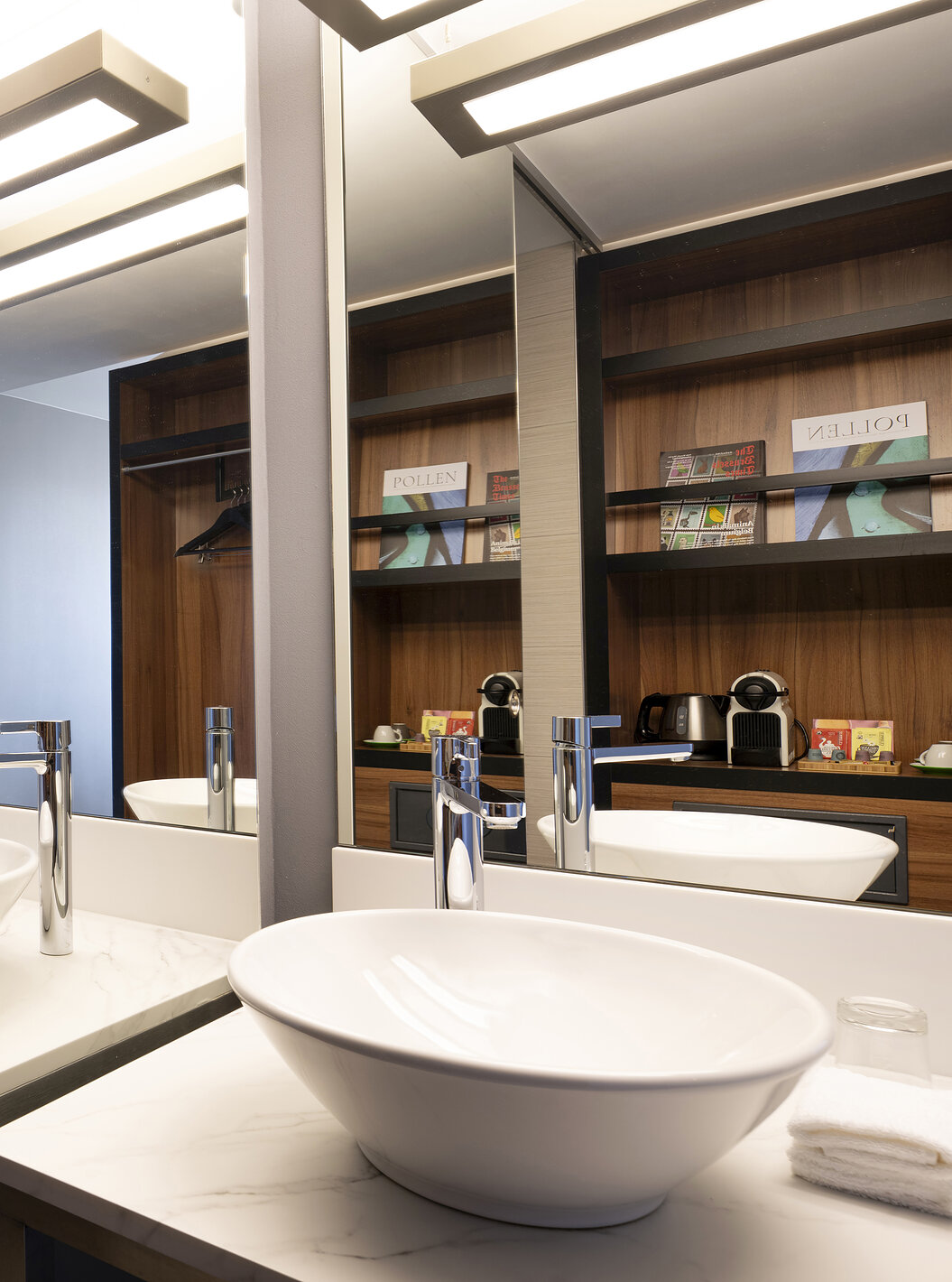 The Superior Twin at Pestana Brussels Schuman has a bathroom with a washbasin, a large mirror, and a shower