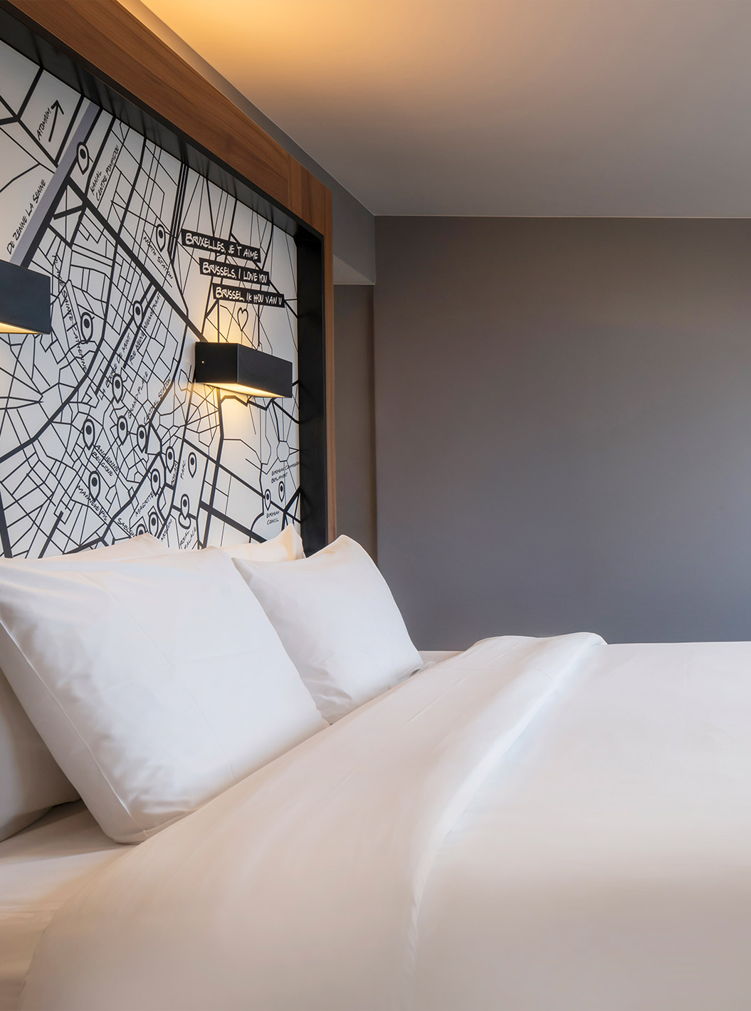 The Standard King at Pestana Brussels Schuman has a double bed with white sheets and a wall lamp