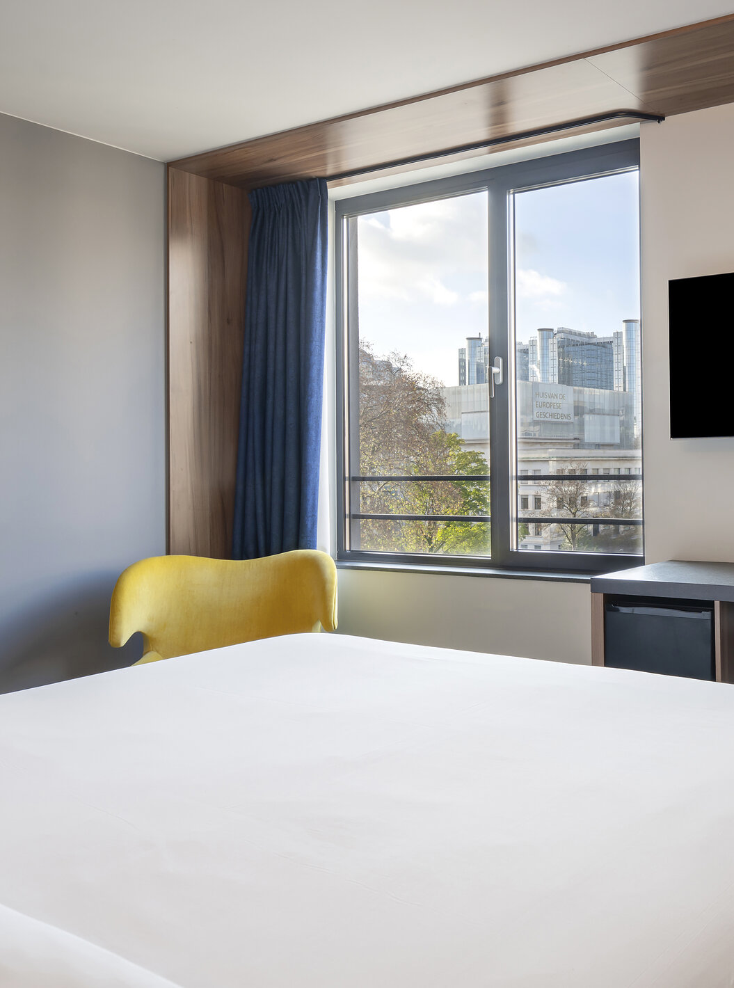 The Standard Twin at Pestana Brussels Schuman has two single beds, a yellow chair, and a window with a view