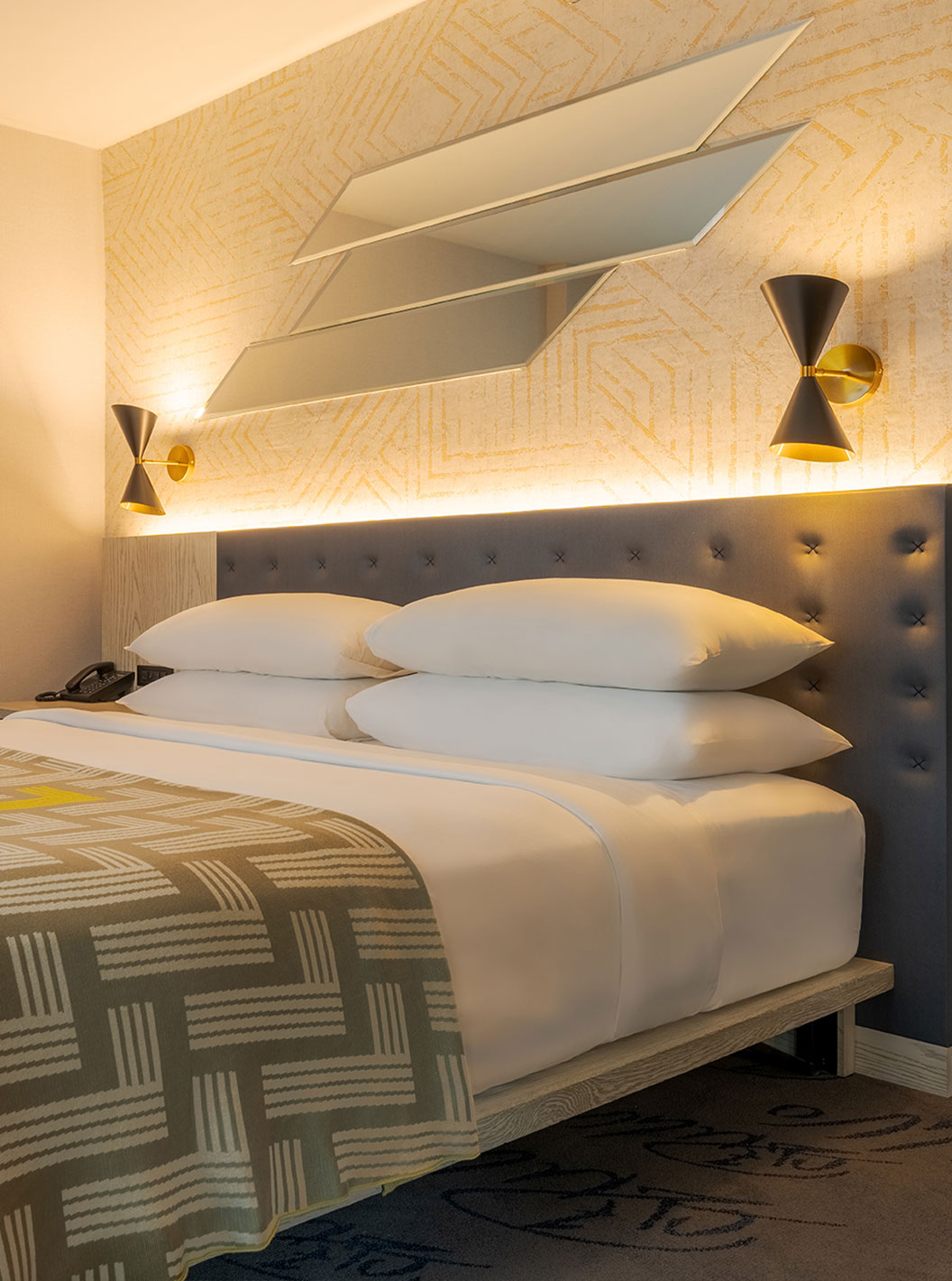 The Superior King High Floor ADA at Pestana CR7 Times Square has a bedside table with a lamp and a mirror